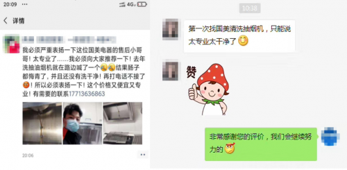 往年李女士都是让老公去街边找游击的清洗工上门清理,因为过年前在国美置办新电器时了解到国美管家提供清洗服务,便在微信公众号上下单,预约购买了油烟机清洗服务。3月25日晚下单,很快便有工作人员主动联系李女士,确定好上门的服务时间、地点。