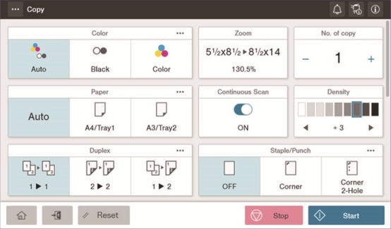 ineo+ 550i系列新品对操作面板的二级菜单进行了重新布局,用户可通过上下拖动屏幕的方式实现菜单滚动,选择自己所需的作业设定,不再需要进入多层嵌套的菜单即可完成操作。该系列新品还加入了全新的卡片式交互界面,将所有复印设置项同时呈现在一个界面上,用户可一次性设置所有的输出参数,大幅提高工作效率。