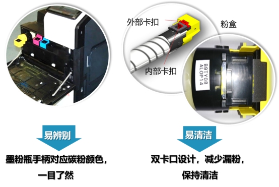 在耗材的安装设计上,ineo+ 550i系列新品将原本的单色墨粉瓶手柄改为多色手柄,碳粉颜色与墨粉瓶手柄颜色一一对应,方便用户更换碳粉耗材;粉盒采用了双卡口设计,能有效减少漏粉,保持清洁;直推式卡槽改变了原本的旋转安装碳粉的方式,更加方便用户操作。