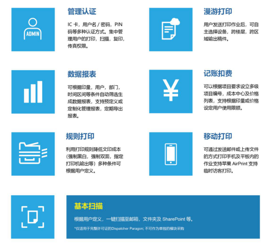 为了助力用户实现更加高效的打印管理以及办公扫描,DEVELOP德凡还可搭载派睿文印管理解决方案Dispatcher Paragon和非凡扫描工作流解决方案Dispatcher Phoenix(以下简称“派睿文印管理解决方案”和“非凡扫描工作流解决方案”)供用户根据实际情况选购使用。
