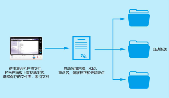 非凡扫描工作流解决方案具有强大的拓展性,采用了模块化的架构,其三大核心工具:工作流设计工具、网页应用、工作流调度工具,可支持用户通过自由添加可选的模块来提升工作流程的效率。在应对复杂的工作流程时,用户可在复合机面板上直观地浏览、选择保存文件夹,实现快速扫描文件并自动发送至指定路径,有效简化大批量扫描和索引流程。
