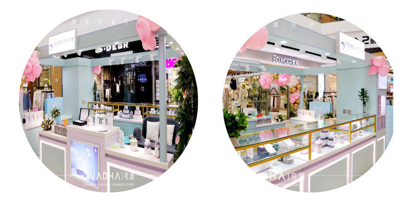 除了商场专柜,社区体验店与生活美容服务店也是夸迪延展业务、突破传统品牌壁垒的又一利器。目前,华熙夸迪已经在山东、浙江、广东、江苏、陕西、内蒙古等省份拥有超过50家线下体验店与服务店。