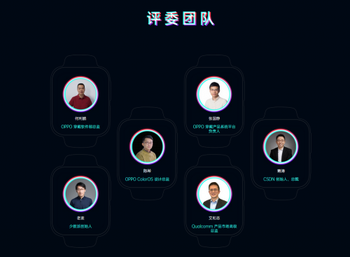 在作品评分、审核方面,OPPO集齐了一批程序开发界“大佬”级别的专业人士前来坐镇,他们分别是:OPPO穿戴软件部总监何利鹏,OPPO穿戴平台系统负责人张国静,OPPO ColorOS设计总监陈希,CSDN创始人、总裁蒋涛,少数派创始人老麦,Qualcomm产品市场高级总监艾和志。