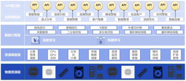 资源调度层。该层负责上层 AI 开发任务对各类资源的集中调用,能有效加快模型训练速度,确保各类资源的高效使用,帮助客户缩短 AI 模型训练周期,加快上线速度。同时,训练和模型在线服务均采用容器化解决方案,它们的环境与物理机隔离,可移植性更高,更安全。