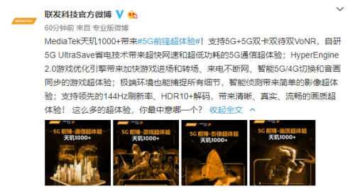 从目前的预热微博海报可以看出,iQOO Z1具备旗舰芯片、疾速5G、畅快屏幕、神仙音质、强劲续航,这五大优势。而这些优势,正是基于MediaTek天玑1000Plus领先业界的旗舰性能芯片技术实力,与MediaTek天玑1000Plus“5G前锋超体验”的微博海报相互呼应,该合作面向年轻人群诚意满满。