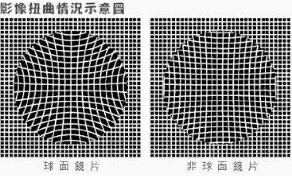 首先,镜片分为球面和非球面,下面用一个图来描述会更直接一些,非球面的镜片边缘变形更小,现在市面上主流的镜片都是非球面的镜片。