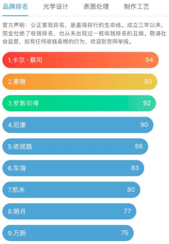 我们可以看到这就是目前市面是主流的镜片排名,这上面的镜片品牌都还不错,我们去到店里的时候可以优先选择上面的这一些品牌,但是需要注意的是,这些品牌的镜片在不同的眼镜店会有不同的差异,我们以蔡司镜片举例,像武汉知名的精益、宝岛大概在9折左右,在一些写字楼里面的眼镜店如造寸眼镜,只有5折,价格差异还是比较大,如果去眼镜店选择这种类型的镜片一定注意杀价。