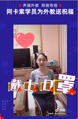 目前,该活动受到了众多小学员的积极响应,孩子们纷纷在视频中分享安全防疫知识。学员lily表示,“疫情期间一定要多多注意,照顾好自己。首先不要去人多的地方,呆在家里或者其他安全的地方;其次,要勤洗手;第三,出门时要带上口罩。”学员们虽然与外教们远隔万里,但稚嫩的声音里尽显对老师的关心与爱戴。