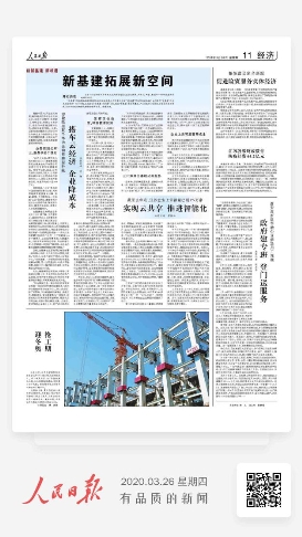 3月26日,《人民日报》开设“新基建 新机遇”专栏,报道“新基建”在城市建设、产业发展等方面的扎实做法和创新实践,见证中国经济的强大韧劲和澎湃活力。其中,经济版面刊登《新基建拓展新空间》专题文章,聚焦华为云助力滁州产业升级以及助力江苏工业互联网发展示范区建设的案例,树立“新基建”的标杆示范。