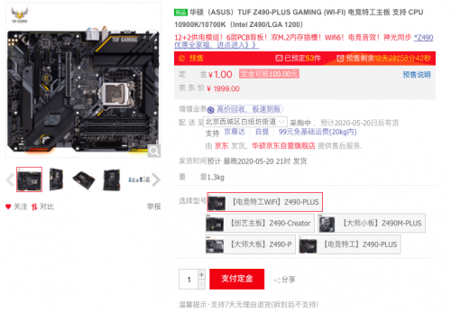 TUF GAMING Z490-PLUS(WI-FI)主板采用军规认证用料、强化型供电解决方案以及全方位散热设计,可为玩家提供出色的游戏性能和效率,是年轻玩家的装机首选。京东价1999元,现在活动预购1元定金可抵100元,最终到手价仅1900元,心动不如行动。链接:https://item.jd.com/100012943474.html