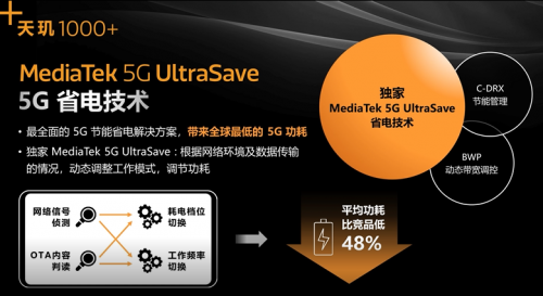 为实现高性能下的低功耗表现,天玑1000+ 搭载联发科独家的5G UltraSave省电技术,可根据网络环境及数据传输情况,动态调整调制解调器的工作模式,包括电源配置和工作频率等,结合BWP动态带宽调控、C-DRX节能管理等,通过最全面的5G节能省电解决方案,带来全球最低的5G功耗。