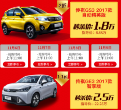 双十一期间,大圣车服新车秒杀低至1.1折,11月6日至11日每天一台车参与秒杀。原价8.88万元的传祺GS3,秒杀价仅需1.8万。参与传祺GS3秒杀的用户,必须在11月1日至5日期间进入大圣车服平台进行预约,随后在11月6日至10日每天11:00参与秒杀。而原价22.28万元的新能源汽车传祺GE3,直接降价20万,2.5万即可开回家。该车从11月1日起接受秒杀预约,11月10日至11日每天11:00参与秒杀。