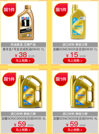 11月1日至4日,原价128元的美孚金1号机油现仅38元,原价159元、599元的龙蟠1L和4L全合成机油低至15元、 59元。还有美国科技雪佛龙机油直接享受半价,每满199减100,满98减49。为了吸引更多用户的关注,力度虽然空前,但每人仅限一件。