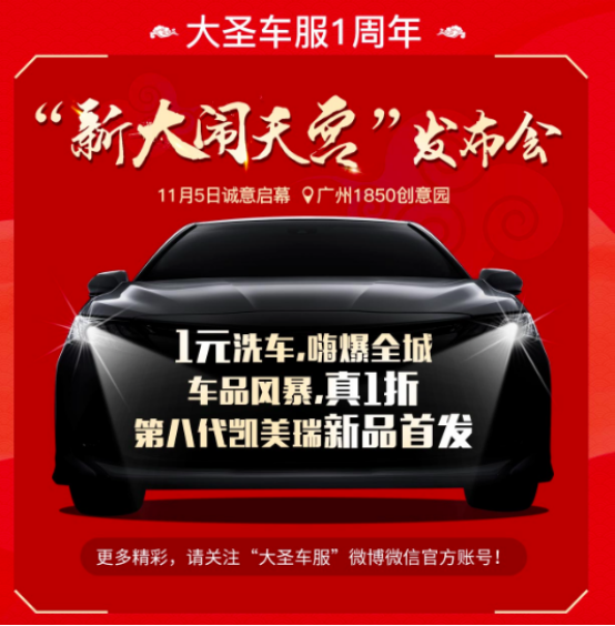 大圣车服11月1日上线的“大圣车服 大闹双11”活动中可以看到,活动覆盖新车、车品配件、养车三大领域。线上广汽传祺GS3 仅需1.8万元,金美孚机油降至38元,不怕全网比价;线下,广州100家社区店洗车只需1元,4S店保养低至65折,等等。促销力度堪称全年之最,俯瞰全网。