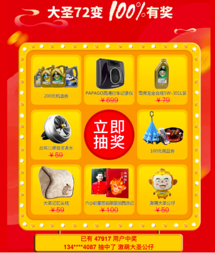 此外,大圣车服还推出了100%中奖幸运大转盘活动、品牌日专场活动等。作为国内首个汽车互联网生态平台,这个双十一,大圣车服能否真的为消费者砸上一个亿,我们不妨拭目以待。
