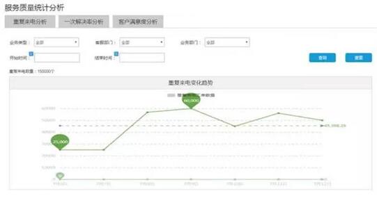 例如,分析人员可以在分析图中,通过分析包括重复来电分析、一次解决率分析、客户满意度等项目评价某个服务组的服务质量,督促其提升服务能力。