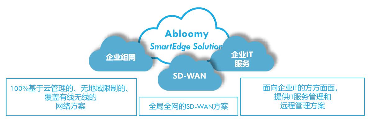 面对广大SMB企业的IT环境在向云迁徙中和完成后的组网需求变化,Abloomy提出了以云WiFi为企业内网组网主干,以SD-WAN为广域网组网基础的全云化管理的企业组网思路,能够全面满足在各种业务场景、各种业务带宽需求和多种安全要求下的网络部署与管理,提供精简的设备组合和丰富的可选功能,具有突出的性价比和方案优势。