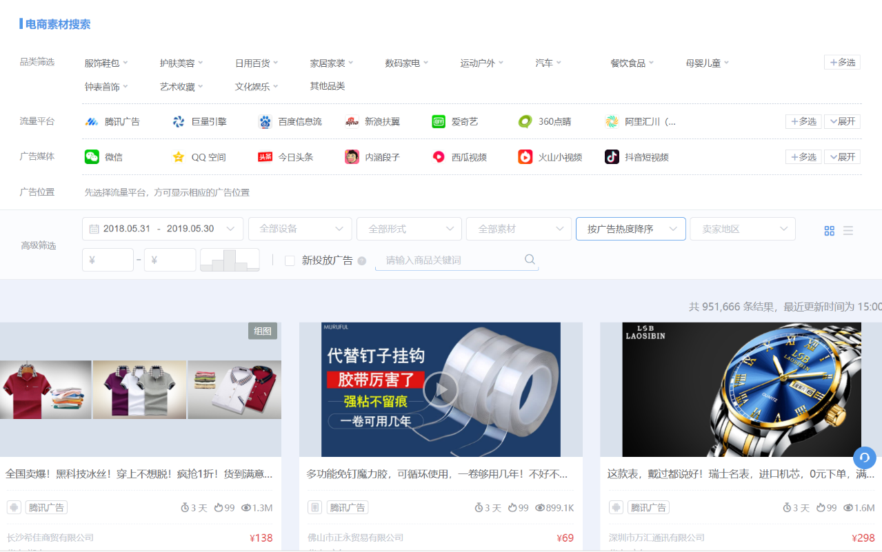 随着直营电商的在各个渠道的比重越来越高,包括头部的腾讯系、头条系、百度系在内的各大流量平台都在积极布局。然后不同的平台和媒体背后的人群是迥然不同的,也代表着运营策略,从选品到素材都应该有差异化。 App Growing将所有的素材按平台、媒体、地区区分,帮商家洞悉大盘背后的人群细分。