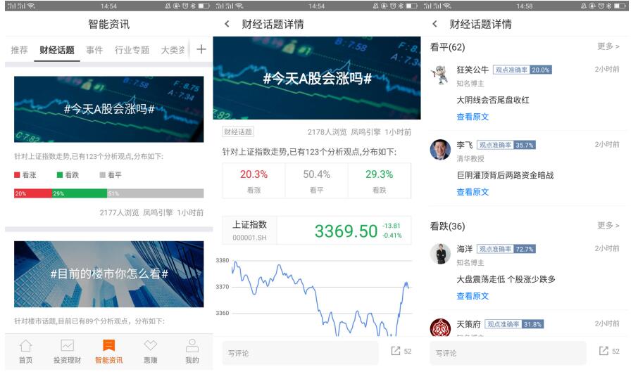 事实上,大部分用户对投资理财知识也并不是特别了解,很难凭借自己检索整理的资讯了解和发现其中“真谛”,如针对#上市后的趣店被看好吗#这一财经热点,普通用户很难从这一新闻事件中窥探出其未来的趋势,而针对这一用户痛点,凤凰金融新上线的“财经话题”板块即可让用户能够轻松的了解相关事件影响。“财经话题”板块,包括多个话题内容,如长期话题#今日A股会涨吗#、#目前的楼市你怎么看#,以及每周更新一个的正反观点冲突话题。