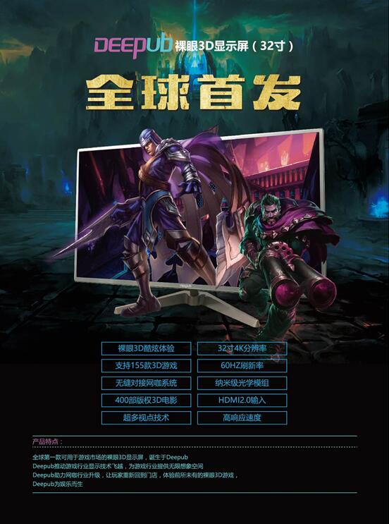 Deepub作为康得新集团旗下新娱乐品牌,在本次ChinaJoy中将携Deepub品牌大杀器—全球首款32英寸裸眼3D显示器亮相E5-S121 Deepub展台。据小编了解,这款裸眼3D显示屏将采用IPS-LED面板,屏幕分辨率高达4K(3840*2160)且可视角度高达89°在支持裸眼3D技术的基础之上还拥有非常迅速的响应时间。具体裸眼3D技术究竟将给玩家带来什么样的新奇体验,还需要玩家们亲自到展台通过裸眼3D游戏和视频来感受黑科技带来的娱乐升级。