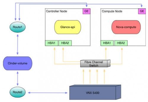 CloudUltra4.4的分布式块存储和FC -SAN商业存储的混合存储架构采用的是Openstack社区版的对接方案,即通过使用Cinder来对接FC-SAN商业存储,Cinder只提供框架,通过调用FC-SAN设备厂商提供的Driver来使用和管理。
