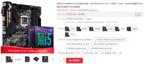 华硕TUF B365M-PLUS GAMING电竞主板设计优良、质量可靠,且性价比出众,其以超强产品力获得诸多玩家青睐,是不可多得的国民电竞硬装。搭配i5-9400F处理器可释放强劲性能,助力玩家在游戏世界一往直前、所向披靡!目前购买板U套装更为实惠,到手仅需1729元,有兴趣的玩家绝不可错过。购买链接:https://item.jd.com/100005786798.html