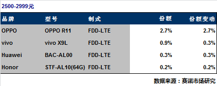 其中,在2500-2999元价位档中,OPPO R11份额高达2.7%,位居第一位,首战告捷。