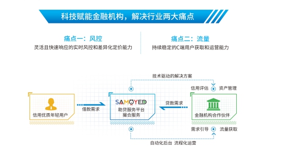 同时,萨摩耶金服结合合作方的具体需求,推出了一套完整的服务解决方案。在这套解决方案中,客户可以获得设计包装、获客引流、风险初筛、定价建议为一体的全方位金融科技服务,从而解决获客、建立用户信用体系和风控等难题,降低整体运营成本,达成精细化运营需求,实现前沿技术到应用场景的落地。