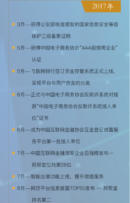 自银监会《信息披露指引》出台,网贷行业“1+3”制度体系完成,邦帮堂严守监管规定,稳健合规发展,目前在合规备案的各项指标完成进程中均走在了行业的前列。