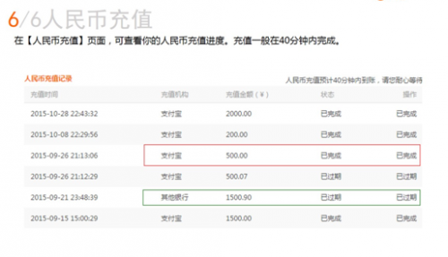 3.9 在【人民币充值】页面,可查看你的人民币充值进度。充值一般在40分钟内完成。