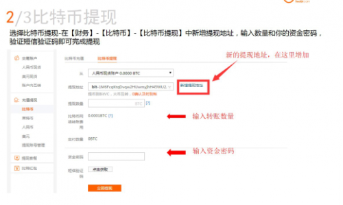 5.2 选择比特币提现-在【财务】-【比特币】-【比特币提现】中新增提现地址,输入数量和你的资金密码,验证短信验证码即可完成提现