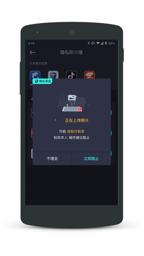 现在,隐私防火墙可以对这类行为进行监测,它会在APP试图上传你的关键个人数据时(比如通讯录、通话记录、相册、短信等),发出提醒,并允许用户自行拦截。