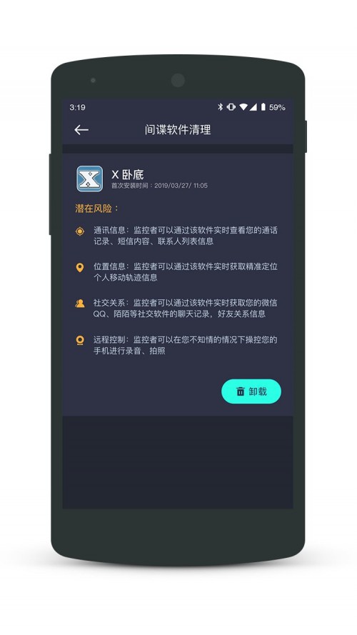 间谍软件是一种手机监听软件。它的获取门槛很低,在一些日常的交易平台、社交网站就能看到售卖渠道,通常千元左右就能买到手。一旦用户安装了包含“间谍软件”的应用,手机里的一切操作、聊天记录、照片、位置信息都会被上传到另一台设备,暴露在监控者眼里。更甚者,还能通过“间谍软件”操控使用者的手机。由于它会隐藏在手机后台运行,不仅我们用肉眼难以将它发现,一般的杀毒软件也无法监测到它的存在。如果不能及时将它发现和清理,带来的就不只是隐私信息上的损失,还会有精神和财产上的损失,如私密照片、支付密码的泄漏等。间谍软件清理功能可以监测间谍软件的存在,一旦发现会推送给用户,用户可以进行一键卸载。我们目前掌握了国内外大部分间谍软件的特征,可以准确识别间谍软件,不会误删正常应用。