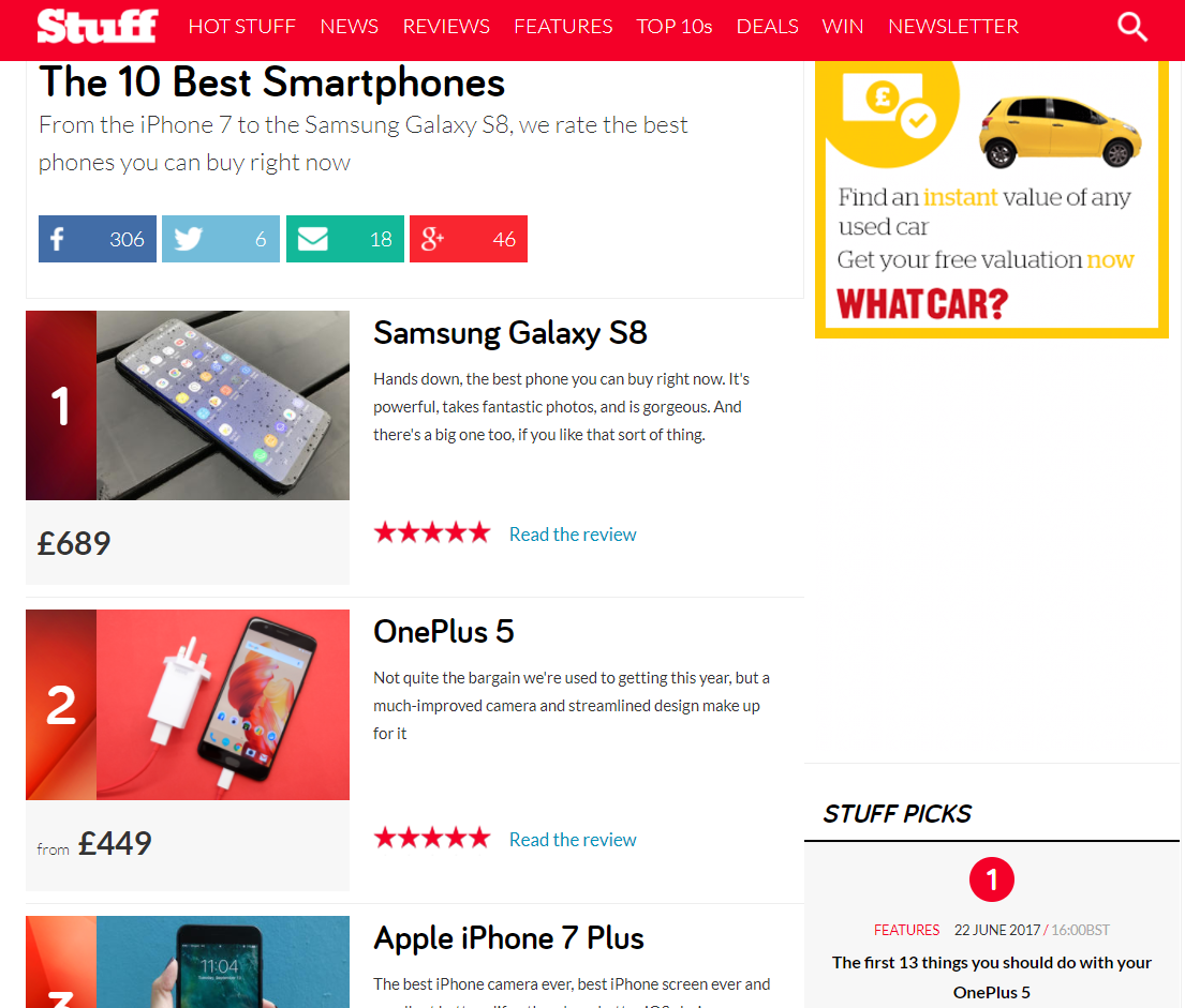 图:《Stuff》十佳智能手机中一加5排名第二