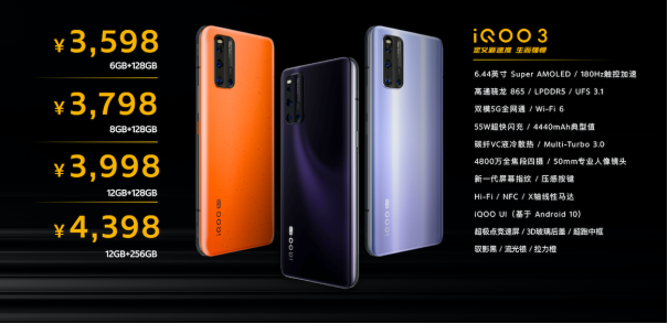 iQOO家族最新成员iQOO 3继2月25日正式发布后,于3月2日10点全网开卖,仅用时1小时,销售额就突破亿元。配置上,iQOO 3共提供了6G+128G、8G+128G、12G+128G、12G+256G四个版本可供选择,价格分别对应3598元、3798元、3998元和4398元,是一台真正意义上的5G性能旗舰。