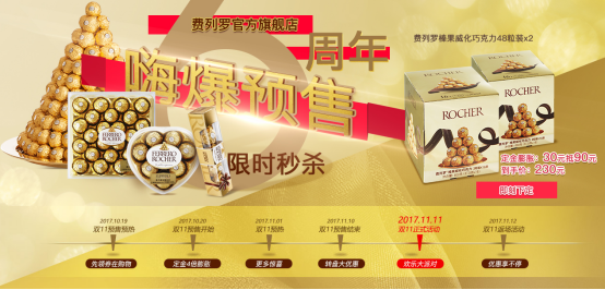 “一千个人有一千种吃费列罗的方法”,大家都知道意大利高品质巧克力品牌费列罗极少降价,但是这次双11折扣力度空前,费列罗96粒分享装,预售只需290元,降幅将近50%,基本属于不预购就抢不到的美味。天猫还和费列罗一起推出1元秒杀优惠券、定金3倍膨胀、预售好礼大转盘等消费者福利,让你过一个甜蜜蜜的双11。