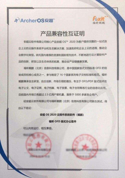 安超OS 2020与福昕OFD版式办公套件完成兼容适配后。对于福昕鲲鹏的用户来说,能够全面提升自身产品的易用性和可靠性,助力企业用户获得持续创新的核心能力。而对于安超OS 2020的用户来说,能够更好的使用文档信息化应用和服务,极大提高了工作效率。