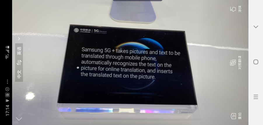 此外,三星还演示了和百度合作的实时在线翻译,仅需我们用手机拍摄需要翻译的图片文字,随后手机即可自动识别图片上的文字并进行在线翻译,翻译后的文字则会嵌在图片原文的位置上,在5G网络下,翻译速度非常快, 时延非常短暂。如此一来,当我们面对外文文字时,即可快速便捷地通过在线翻译及时了解相关信息,让我们无论是出国旅行,还是工作所需时交流均可畅通无阻。