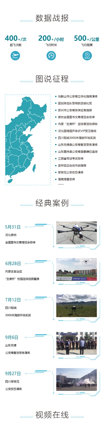 5月,科达警用无人机面世,首飞斩获全国公安警用无人机演练一等奖。半年以来,科达无人机参与测试比武项目40多起,累计飞行时长超过200个小时,飞行距离超过500公里,成功征战全国18个省市,成绩斐然。