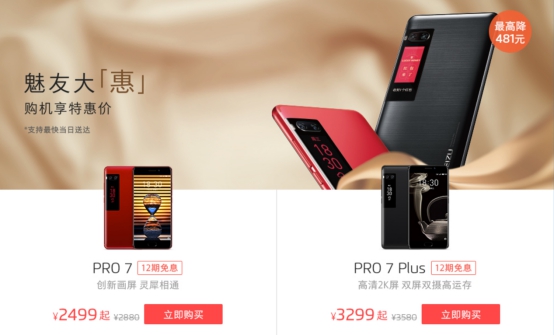 魅友节最大的惊喜当属魅族PRO7了。作为压轴钜惠,魅族PRO7除了支持12期免息分期付款之外,还首次做出官方降价,打出了最高直降481元的优惠力度,起售价仅需2499元,令人咋舌!
