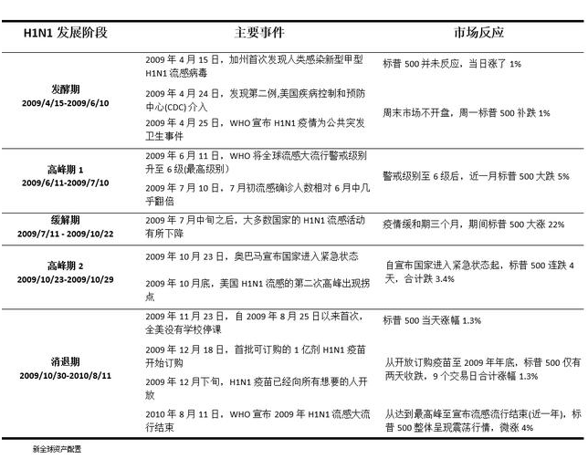 甲型H1N1流感最初于2009年3月在墨西哥暴发,并迅速在全球范围内蔓延。世界卫生组织(WHO)先将此流感称为“人感染猪流感”,后将其更名为“甲型H1N1流感”。疫情于4月中旬蔓延至美国以及全球。下面我们便以美国市场为主线,梳理疫情影响美国的时间线,并将整个过程划分成5个时间段:发酵期,高峰期1,缓解期,高峰期2和消退期。如下表所示: