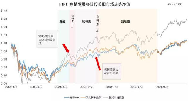 从下方的标普500 净值图中也能更清晰的看到H1N1事件不同阶段,全球主要股指 的不同反应。总体来说由于当时全球股指处于08年金融危机后的超跌修复阶段,疫情冲击只带来了短期的回调,并未影响长期的上涨趋势。而发达国家股票和新兴国家股票走势与标普500走势基本一致,但受到疫情的冲击更大。值得一提的是,由于H1N1 疫情的发源地在墨西哥,新兴市场股票更早地对疫情作出了反应。