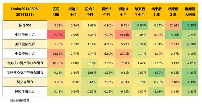 自WHO宣布埃博拉病毒为“国家关注的突发卫生事件”(PHEIC)起,至埃博拉病毒在主要发达国家得到控制的不到5个月中,美股牛市的势头受到了一定的抑制。此一时,彼一时,本次疫情中受影响较小的中国股市却迎来了大牛市的开端,持有中国股票的组合全部跑赢标普500,而且中国股票占比越高的组合表现收益越高。