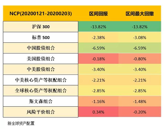 回到本次新冠病毒疫情,尽管目前仍无法断言疫情的拐点为何时,然而巨大的市场冲击已然发生。如上表,区区两周内,只有中国股票占比极小的全球风险平价组合录得正收益。然而,即使持有了坑爹的沪深300,中美核心资产等权配组合依然能依靠投资组合的高度分散性,在一片恐慌抛售中只出现了略高于2%的回撤。