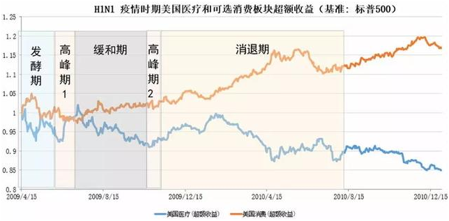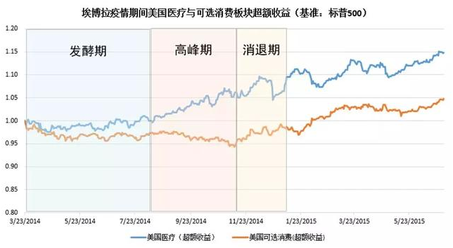 美国医疗板块和可选消费板块在埃博拉疫情期间的表现则大不相同。医疗板块在疫情进入高峰期开始便稳步跑赢大盘,其超额收益即便在疫情消退与结束后亦不曾衰减。相比之下,可选消费则在整个疫情期间内都跑输大盘,但在疫情消退后还是迎来了报复性上涨。