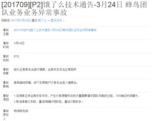 根据饿了么自己公开的事故报告,从2016年1月到4月,技术异常事故平均每个月高达3次(+本站微信networkworldweixin),涉及到各个方面,有系统本身设计问题,有研发流程问题,有跨团队合作问题等。