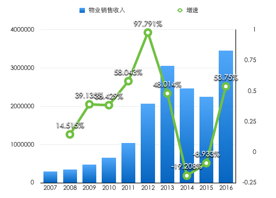 下图为融创的物业销售收入与增速表,可以看出融创的营收屡创新高,仅在2014年、2015年出现短暂的下滑,其他年份即使受到政策影响,也仅是出现增速下滑,但营收并没有收到较大的影响。
