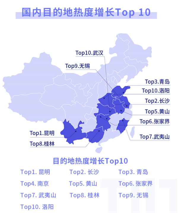 五一假期适逢春夏之交,是一年中十分适宜出游的时段。航班管家&高铁管家大数据显示,五一放假消息公布后,国内目的地搜索增长Top10分别为:云南昆明、湖南长沙、山东青岛、江苏南京、安徽黄山、湖南张家界、福建武夷山、广西桂林、浙江无锡、河南洛阳。