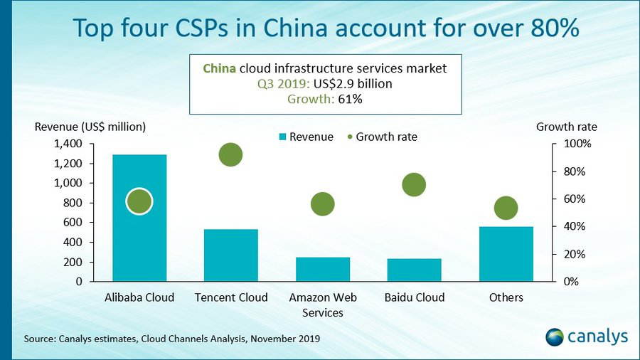 Canalys高级分析师Wong Yih Khai表示,在人工智能服务需求的带动下,中国云计算基础设施服务的市场需求持续快速增长。根据Canalys报告,2019年第三季度,中国云计算基础设施总支出(即市场规模)增长60.8%,达到29亿美元。该季度,中国云计算市场规模占据全球总量的10.4%, 成为仅次于美国的第二大市场。