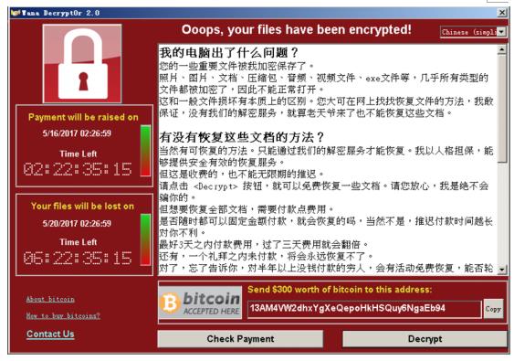被感染的机器屏幕会显示如下的告知付赎金的界面: